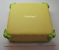 Kagen måler 20x20 cm og gemmer på mandelbunde med hindbærmousse og Tobleronecreme. Den er smurt op med IMBC med Lemon Curd og er overtrukket med blandet marcipan og sugarpaste.